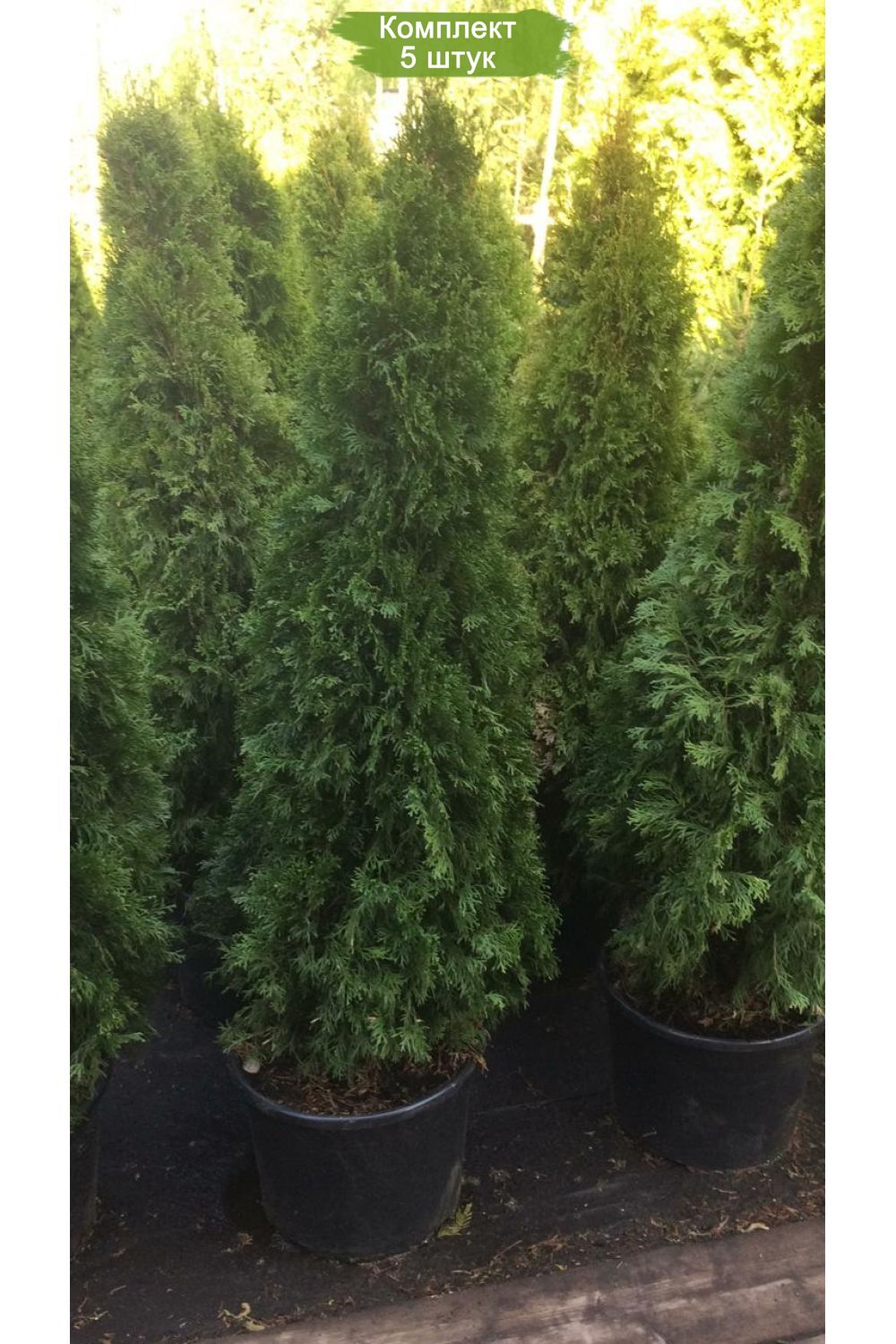 В комплект входят 5 саженцев туи 'Смарагд' высотой от 150 см каждый. Саженцы аккуратно упакованы и готовы к посадке.