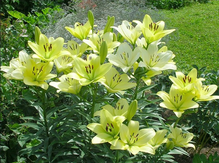 Соцветие – многолучевая кисть. Бутоны, раскрывшись, образуют крупные цветки звёздчатой формы диаметром 20–22 см, ориентированные строго вверх. Начальная окраска лепестков лимонно-жёлтая с лёгким зелёным напылением; по мере распускания тон светлеет, переходя почти в чисто-белый. На одном побеге формируется в среднем 10–12 бутонов, что обеспечивает пышное и продолжительное цветение.